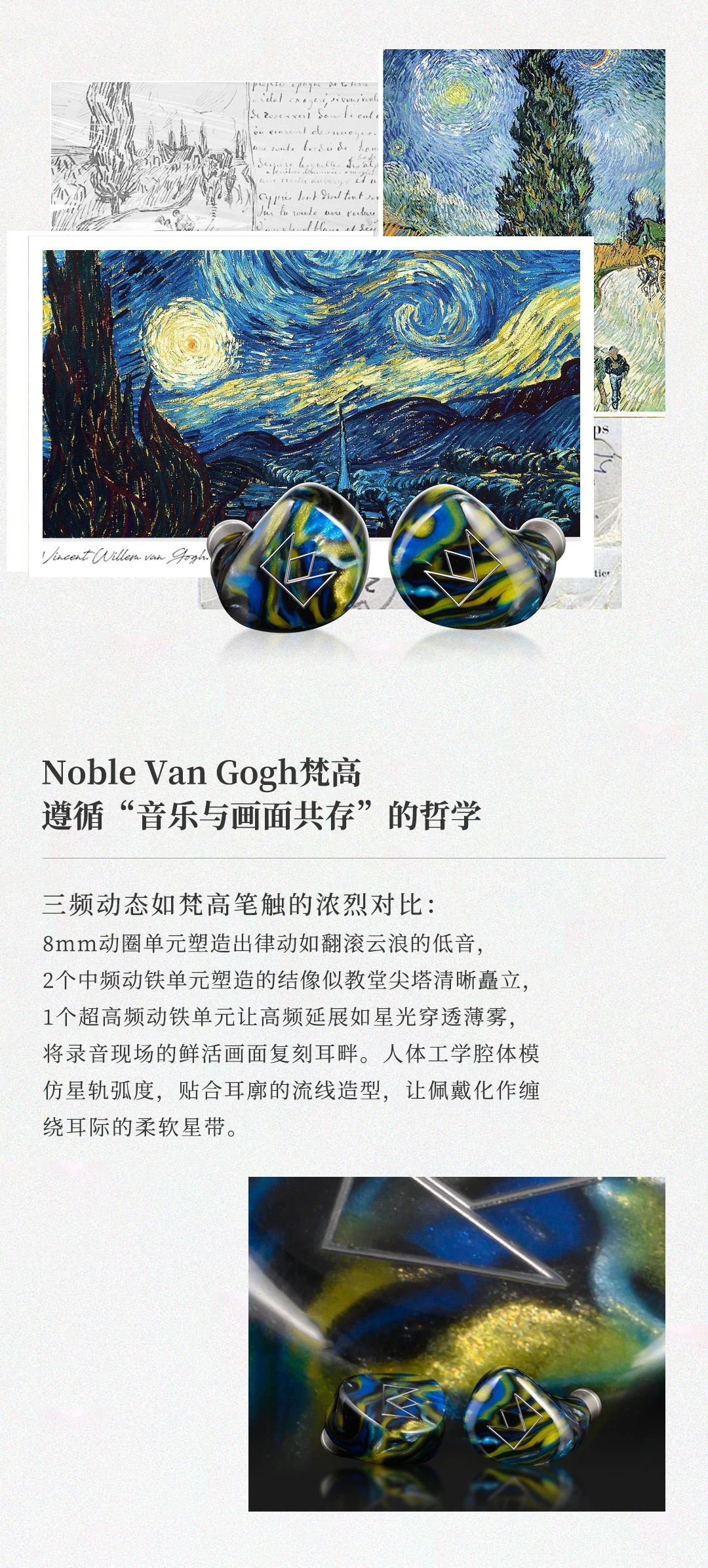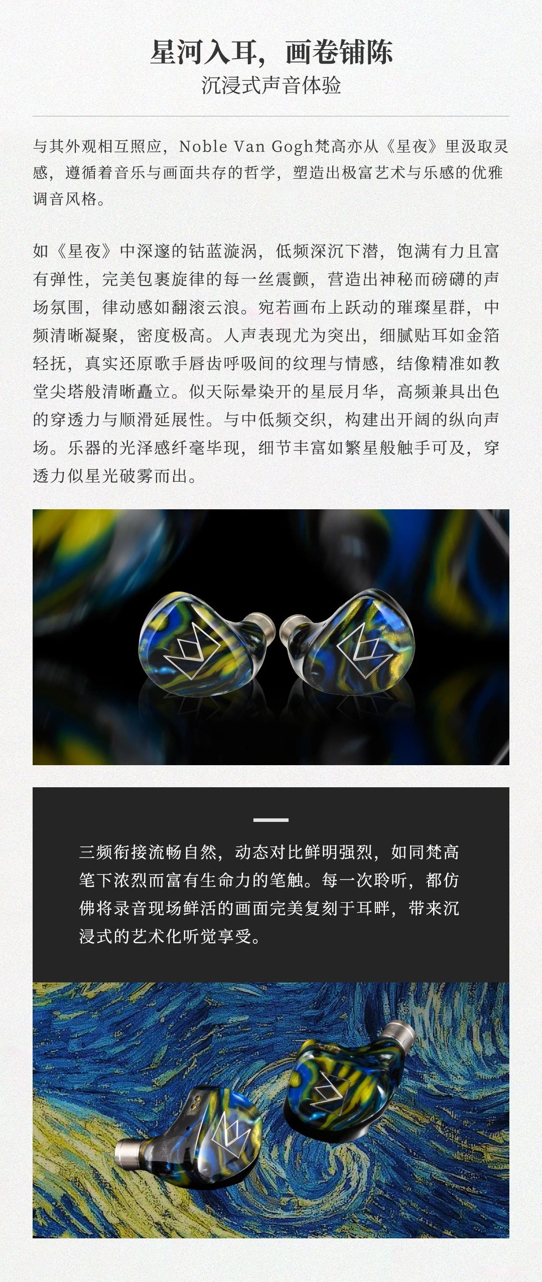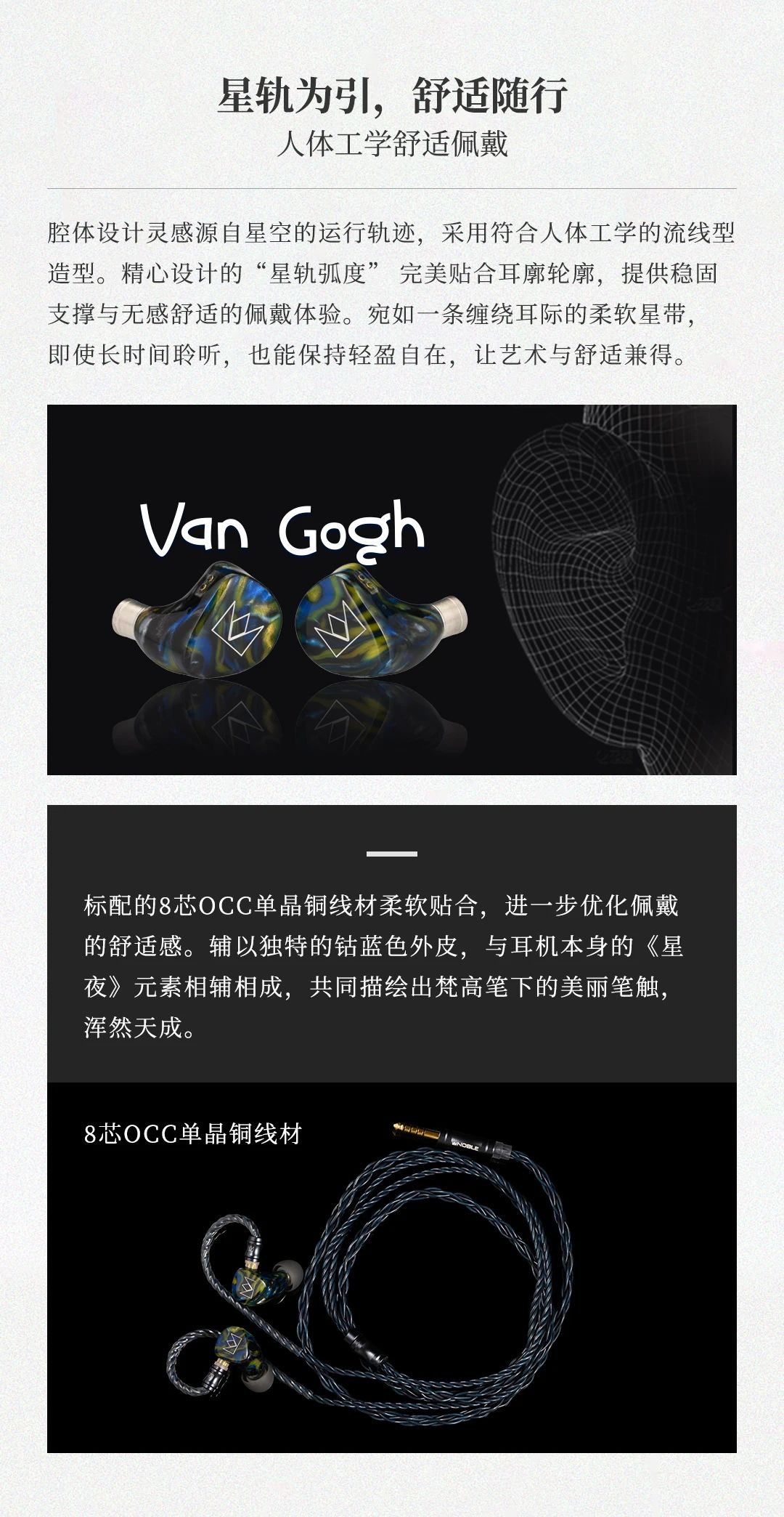 Van Gogh 梵高耳機以梵高名作《星夜》為靈感,將鳶尾藍腔體的粗糲油彩質(zhì)感與星空漩渦般的人體工學(xué)設(shè)計融合,打造可穿戴的藝術(shù)單品。聲學(xué)上采用 4 單元混合架構(gòu) ——8mm 雙磁路動圈單元帶來如翻滾云浪的低頻律動,2 顆 Sonion 動鐵單元精準呈現(xiàn)中頻人聲的細膩情感,1 顆 Knowles 極高頻動鐵單元演繹星光穿透薄霧般的高頻延展,三頻動態(tài)對比鮮明如梵高筆觸,搭配 107dB 靈敏度與 29Ω 阻抗,手機直推即可釋放 20Hz-20kHz 全頻段鮮活聽感。星軌弧度腔體貼合耳廓,8 芯 OCC 單晶銅線材呼應(yīng)畫作元素,讓佩戴成為纏繞耳際的舒適星帶。