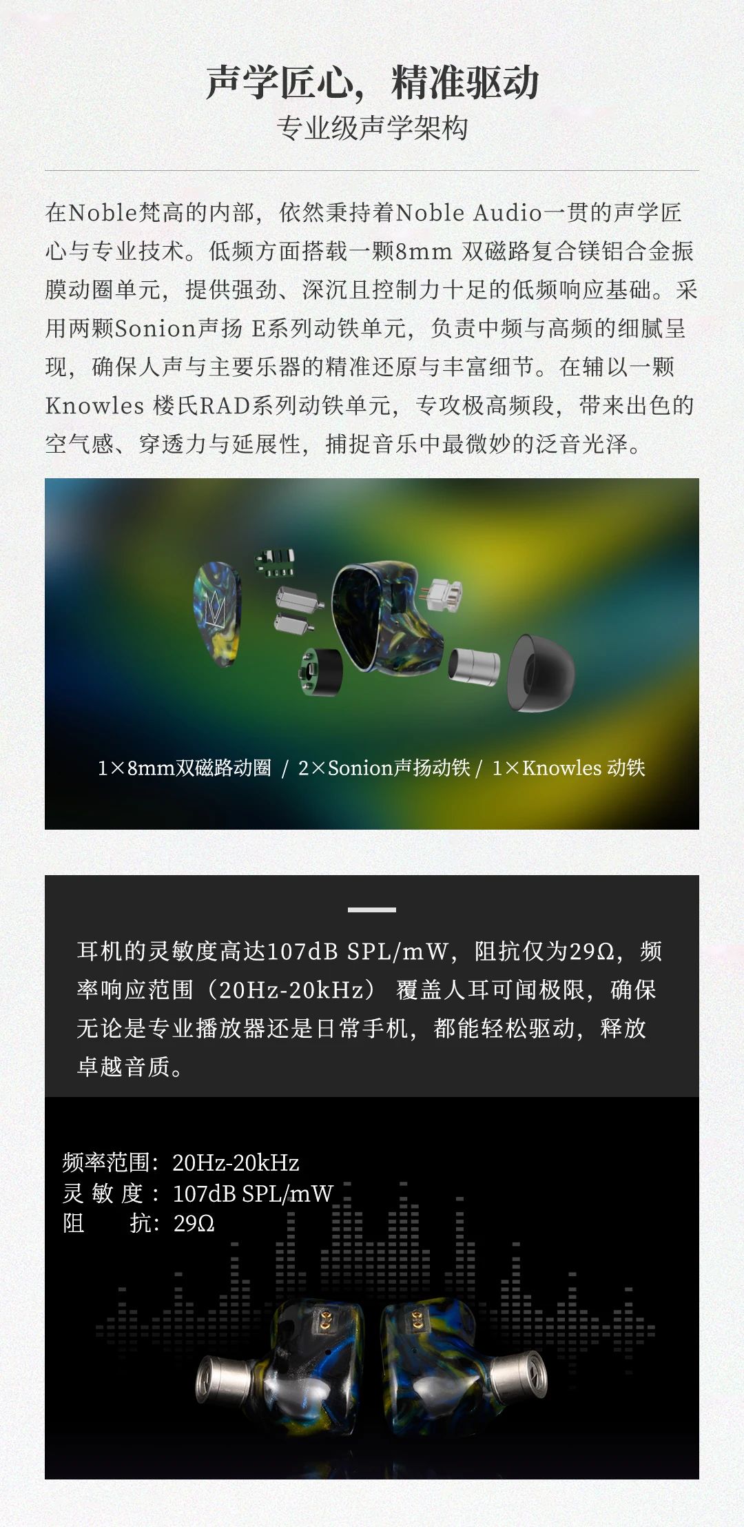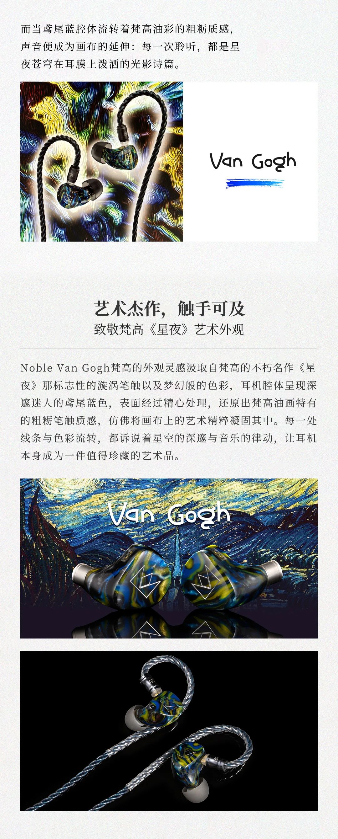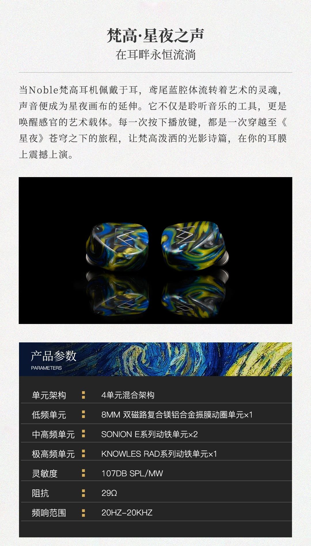Van Gogh 梵高耳機以梵高名作《星夜》為靈感,將鳶尾藍腔體的粗糲油彩質(zhì)感與星空漩渦般的人體工學(xué)設(shè)計融合,打造可穿戴的藝術(shù)單品。聲學(xué)上采用 4 單元混合架構(gòu) ——8mm 雙磁路動圈單元帶來如翻滾云浪的低頻律動,2 顆 Sonion 動鐵單元精準呈現(xiàn)中頻人聲的細膩情感,1 顆 Knowles 極高頻動鐵單元演繹星光穿透薄霧般的高頻延展,三頻動態(tài)對比鮮明如梵高筆觸,搭配 107dB 靈敏度與 29Ω 阻抗,手機直推即可釋放 20Hz-20kHz 全頻段鮮活聽感。星軌弧度腔體貼合耳廓,8 芯 OCC 單晶銅線材呼應(yīng)畫作元素,讓佩戴成為纏繞耳際的舒適星帶。